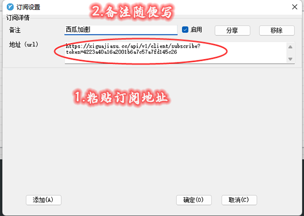 4、把刚复制的订阅地址粘贴进来 备注可以任意填写,点击下方的确定